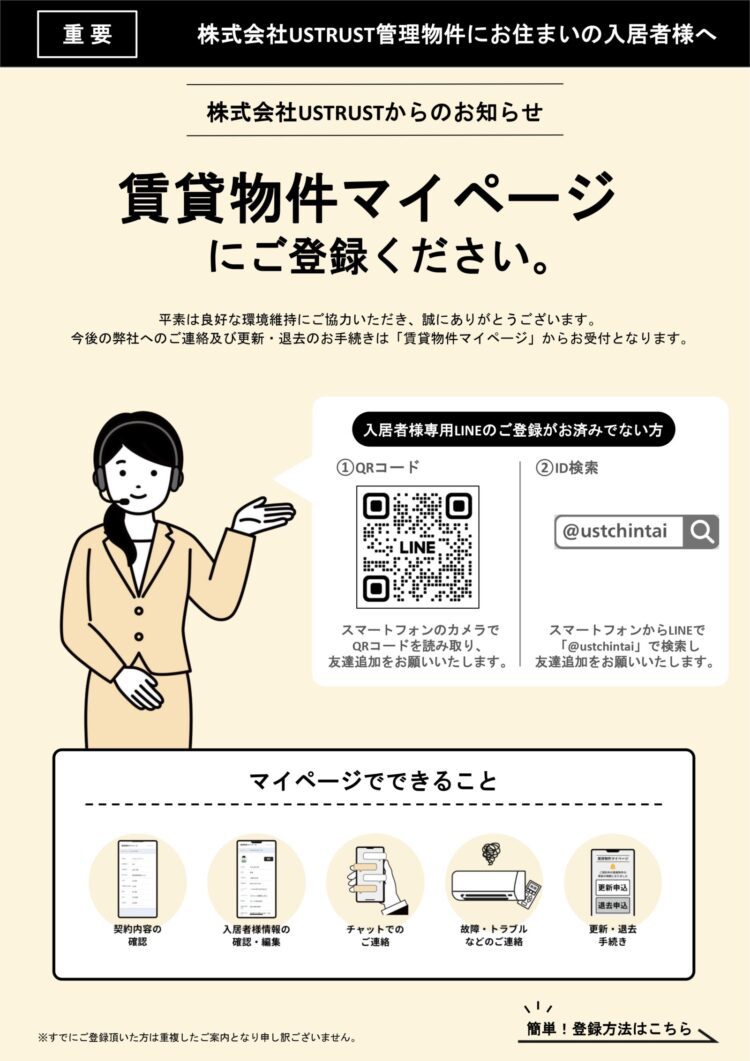 日頃より株式会社USTRUSTの管理物件をご利用いただき、誠にありがとうございます。